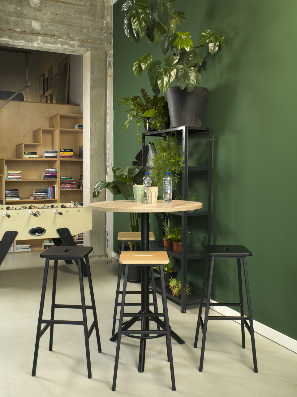 Der BB-6 ist ein zeitloser design Hocker der mit einem vierbeinigen mattschwarzen Metallgestell mit pulverbeschichtet ausgestattet ist. Der Sitz besteht aus Sperrholz mit schwarz lackierter Eiche. Zusätzlich verfügt der Sitz über eine Aussparung, die das Anheben des Hockers erleichtert.