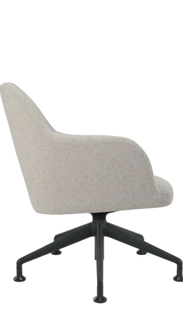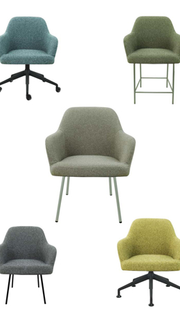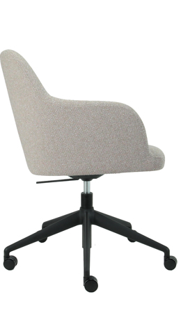 Natürlich darf in der Lola-Serie auch der Bürostuhl/Versammlungsstuhl nicht fehlen. Er ist mit einem schwarzen Designer-Fußkreuz aus Kunststoff mit Multifunktionsrädern für harten und weichen Bodenbelag ausgestattet. Dieser Bürostuhl ist durch eine Gasfeder höhenverstellbar. Außerdem verfügt er über eine Donati-Kippmechanik, die sich in vertikaler Arbeitsposition arretieren lässt. Wie bei allen Lola-Varianten gibt es diesen Stuhl mit Sitzschale in 3 verschiedenen Rückenhöhen, mit dem Bouclé-Stoff Society in 5 Farben, aus zu 100 % recyceltem PP.