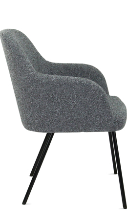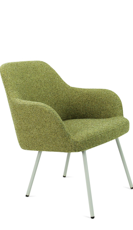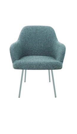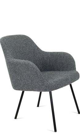 Moderner, schlanker Loungesessel, bei der Sitzschale sind 3 Rückenhöhen möglich, mit Bouclé-Stoff Society in 5 Farben aus zu 100 % recyceltem und recycelbarem Material. Auch den vierbeinigen Rahmen gibt es in 5 Farben. Möglich sind also Ton-in-Ton-Kombinationen wie auch ein Farbmix. Lola ist eine vollständige Produktreihe, deren diverse Modelle perfekt miteinander kombinierbar sind.