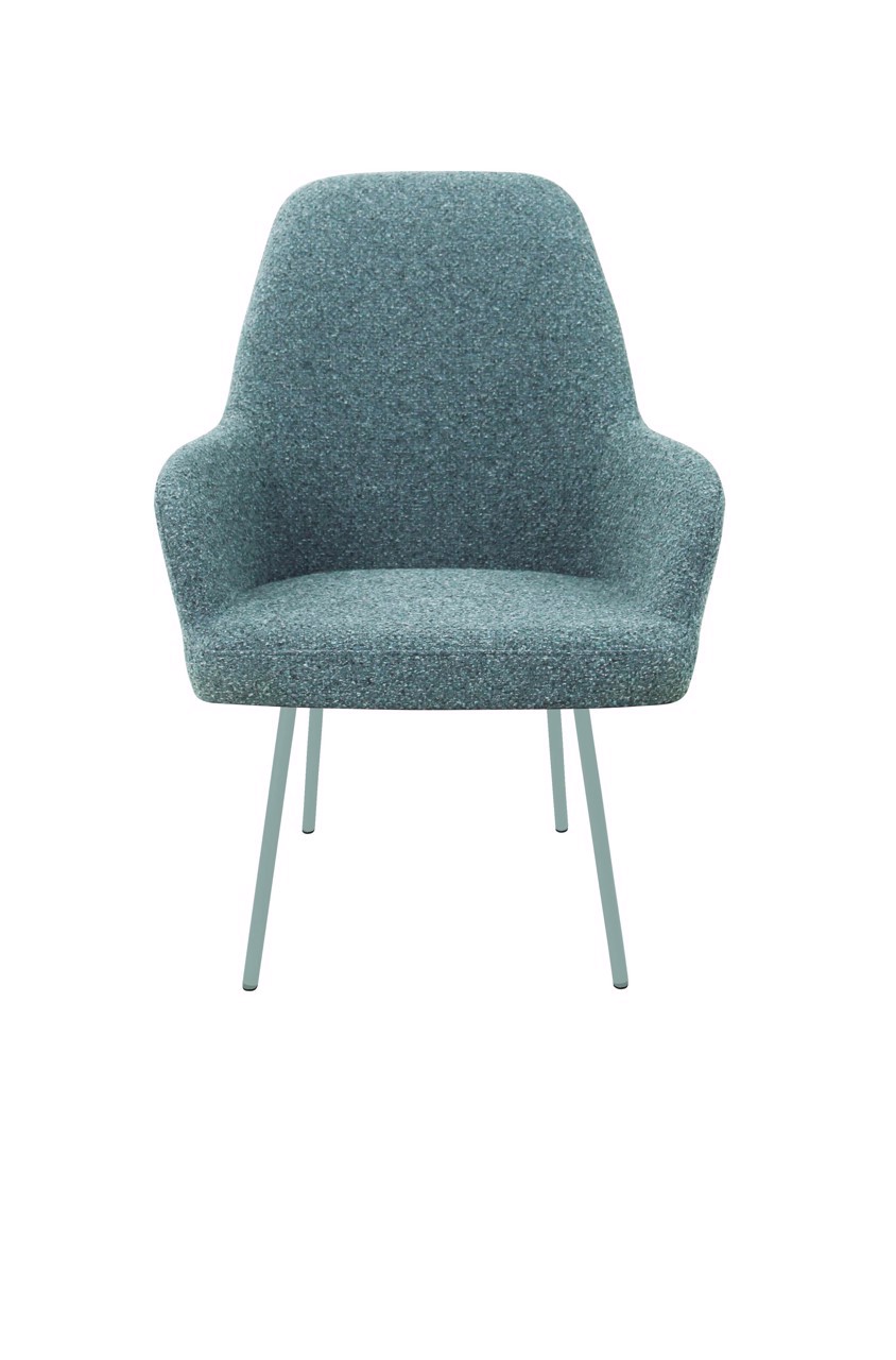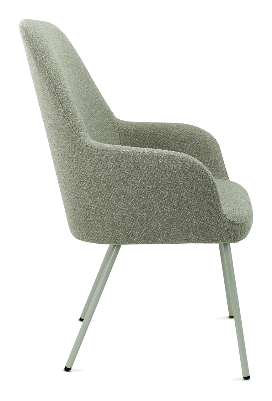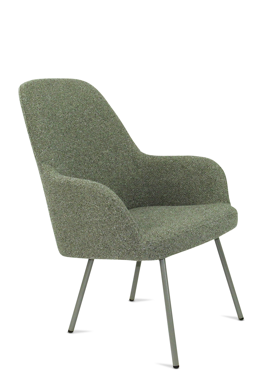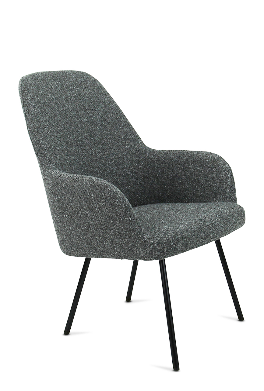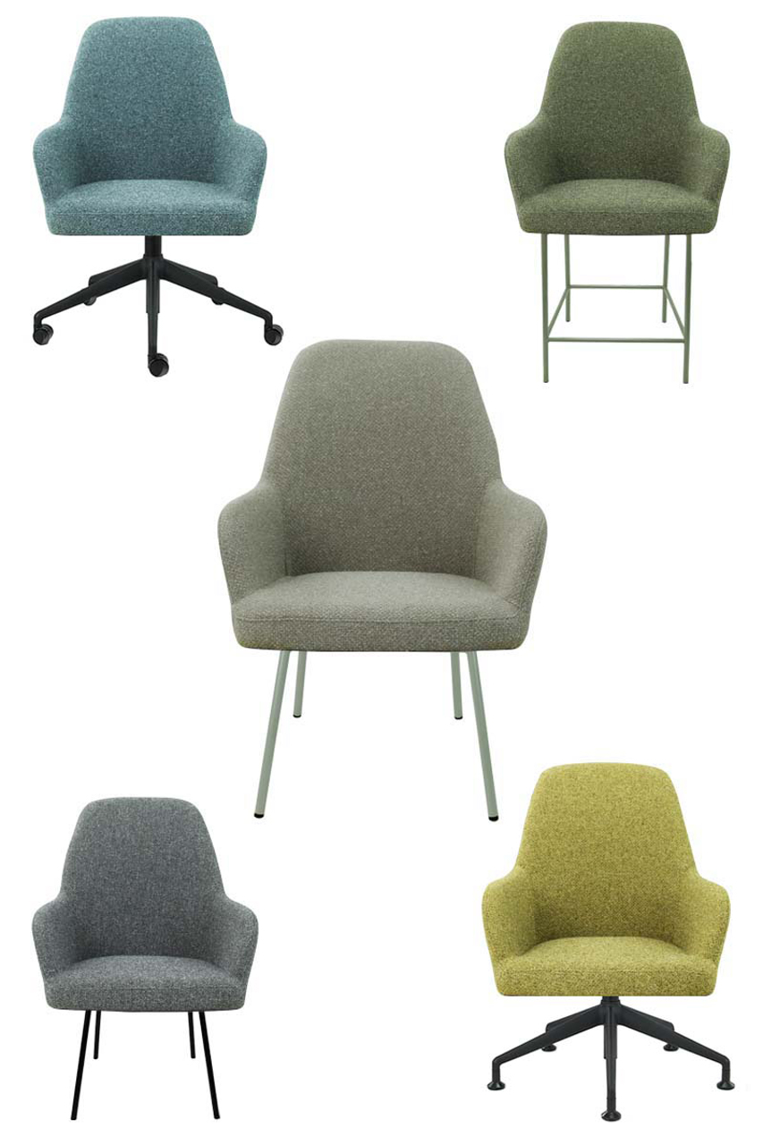 The seat shell can be supplied in 3 back heights and in 5 fabric colours of bouclé fabric Society. Society fabric is made of 100% recycled PP and is also 100% recyclable. The frame is also available in 5 colours for matching shade combinations to the fabric or a combination thereof.