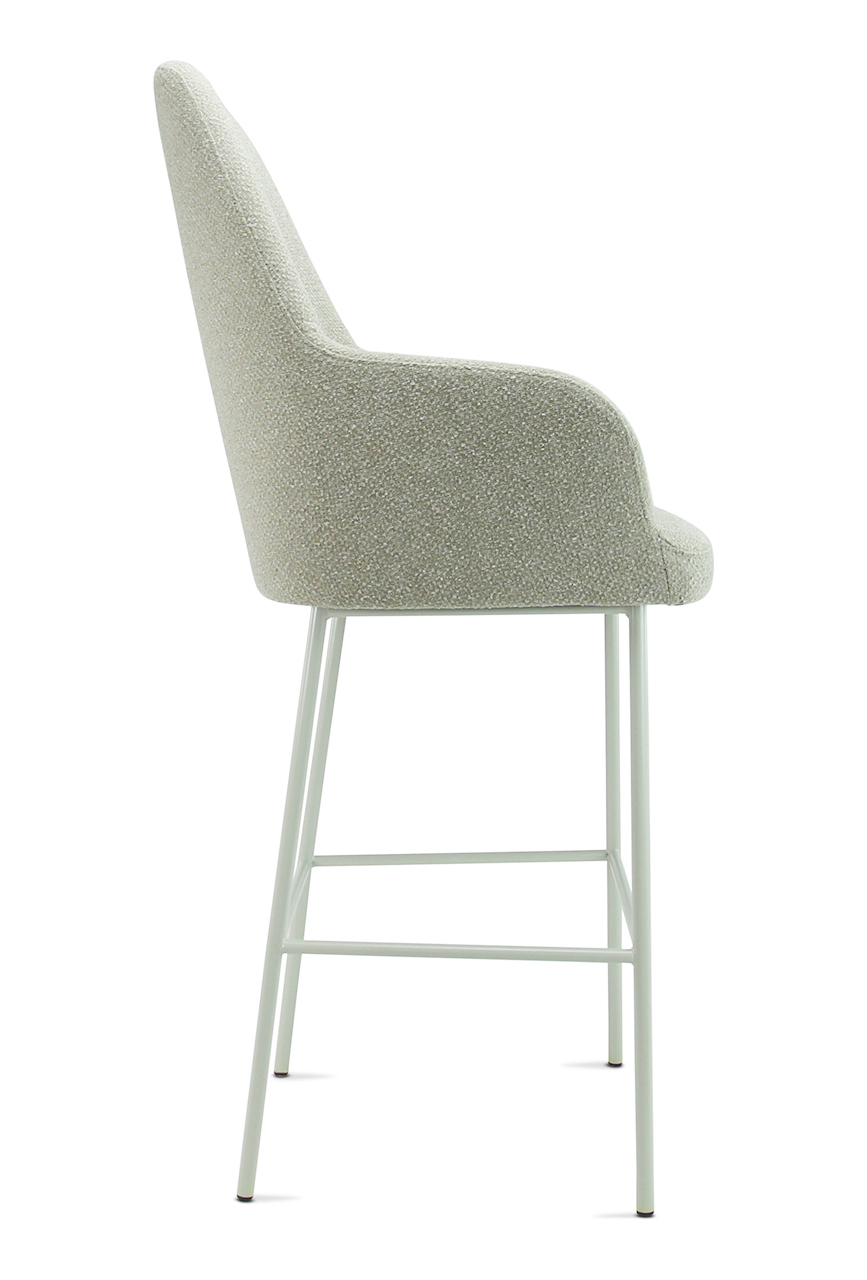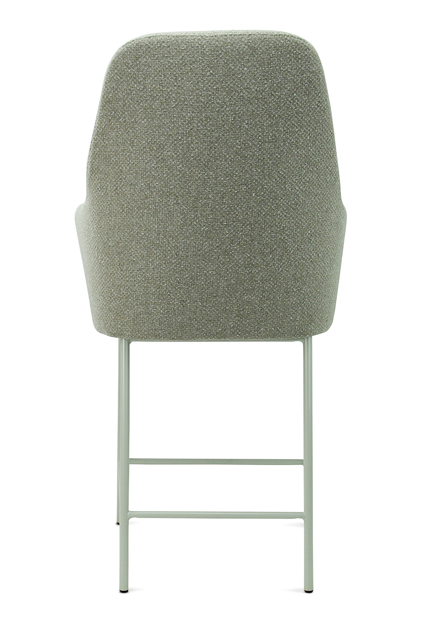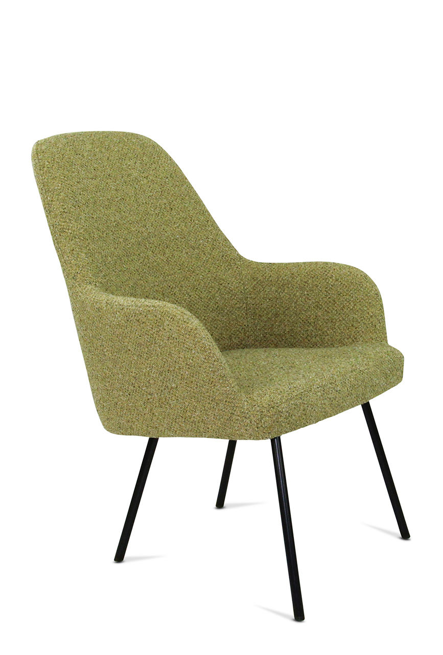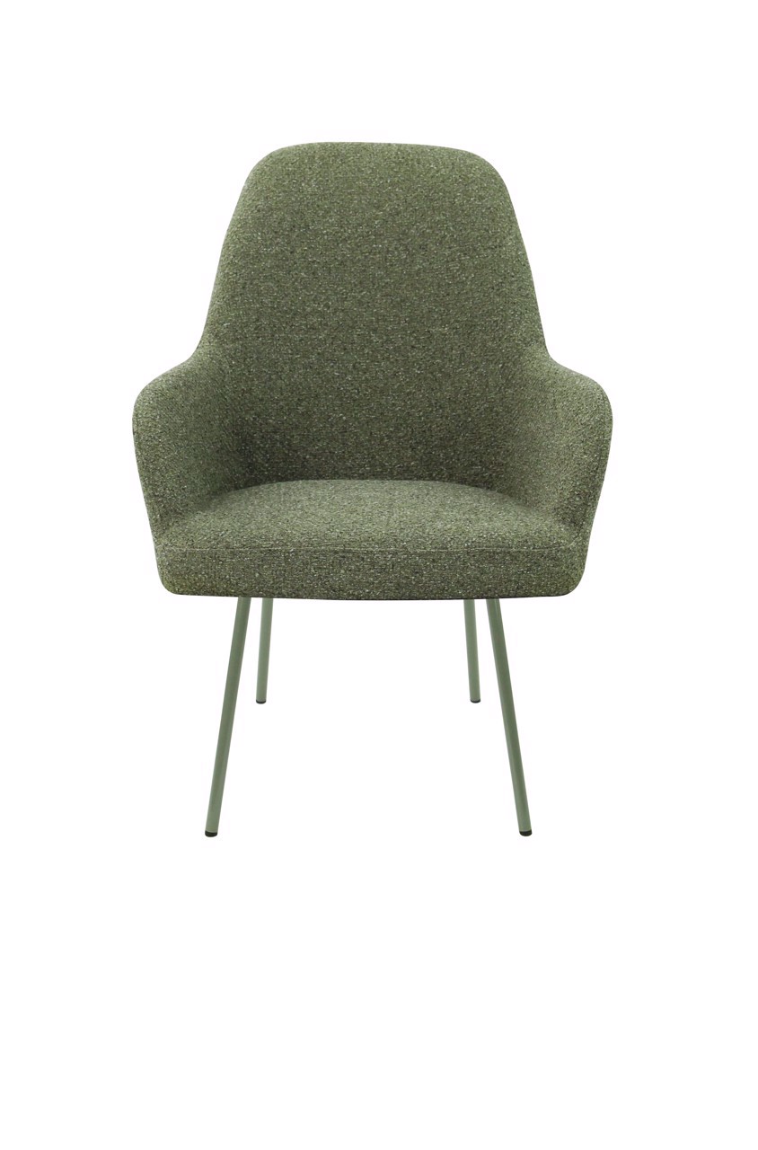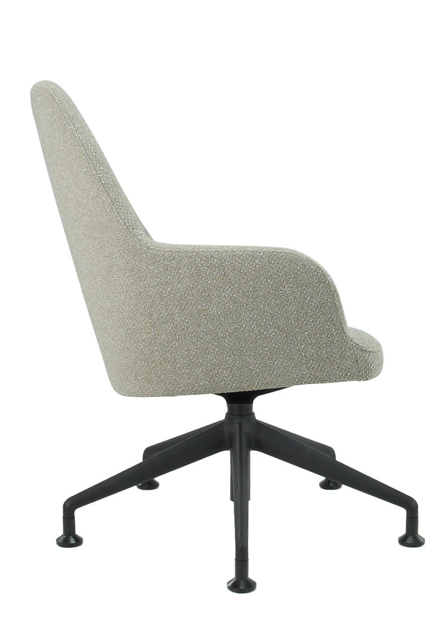 The seat shell can be supplied in 3 back heights and in 5 fabric colours of bouclé fabric Society. Society fabric is made of 100% recycled PP and is also 100% recyclable. The frame is also available in 5 colours for matching shade combinations to the fabric or a combination thereof.
