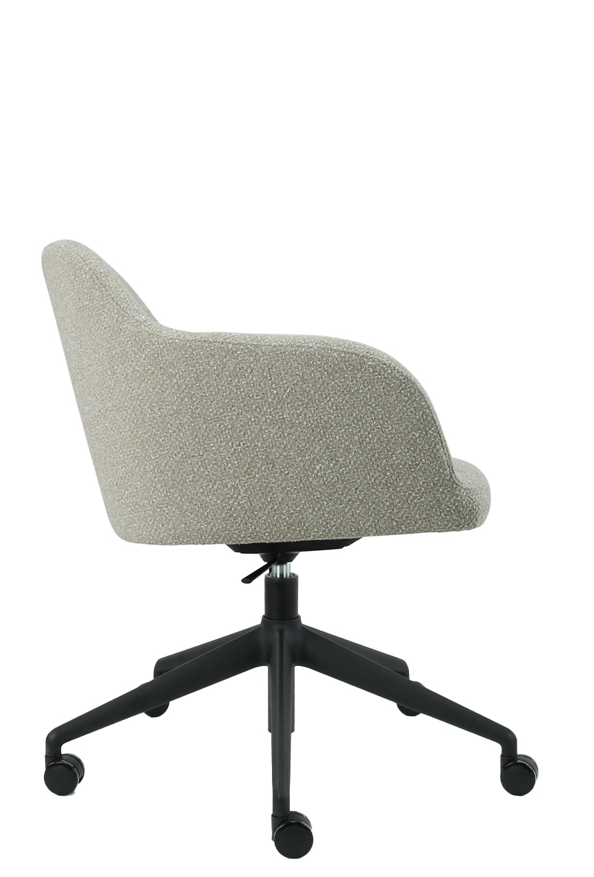 Dans la gamme Lola, la chaise de bureau / réunion est bien sûr incontournable. Équipée d'une base design en plastique noir dotée de roulettes multifonctionnelles pour les sols durs et souples. Cette chaise de bureau est réglable en hauteur au moyen d'un vérin à gaz et est également équipée d'un mécanisme de basculement Donati qui peut être bloqué en position de travail verticale. Comme toutes les variantes de Lola, cette chaise peut être équipée de 3 coques d'assise / hauteurs de dossier différentes dans 5 couleurs de tissu bouclé Society fabriqué à partir de 100 % de PP recyclé.