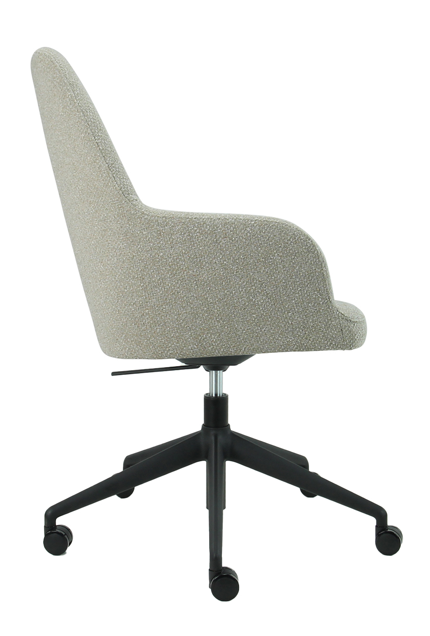 Dans la gamme Lola, la chaise de bureau / réunion est bien sûr incontournable. Équipée d'une base design en plastique noir dotée de roulettes multifonctionnelles pour les sols durs et souples. Cette chaise de bureau est réglable en hauteur au moyen d'un vérin à gaz et est également équipée d'un mécanisme de basculement Donati qui peut être bloqué en position de travail verticale. Comme toutes les variantes de Lola, cette chaise peut être équipée de 3 coques d'assise / hauteurs de dossier différentes dans 5 couleurs de tissu bouclé Society fabriqué à partir de 100 % de PP recyclé.