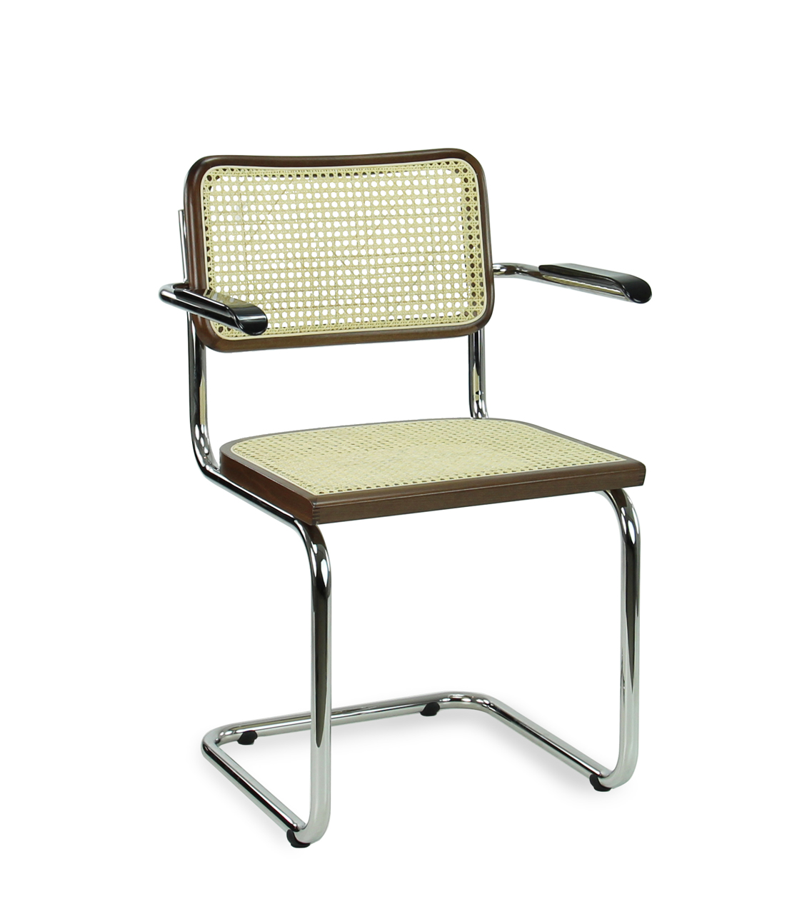Voorzien van een rugleuning en zitting in het tijdloze webbing is de Francesca een echte Bauhaus klassieker en toch supermodern in deze tijd. De stoel heeft een chroom sledeframe en walnoot rand van de zitting en rugleuning, en is voorzien van armleggers gemaakt van gematteerd bakeliet.