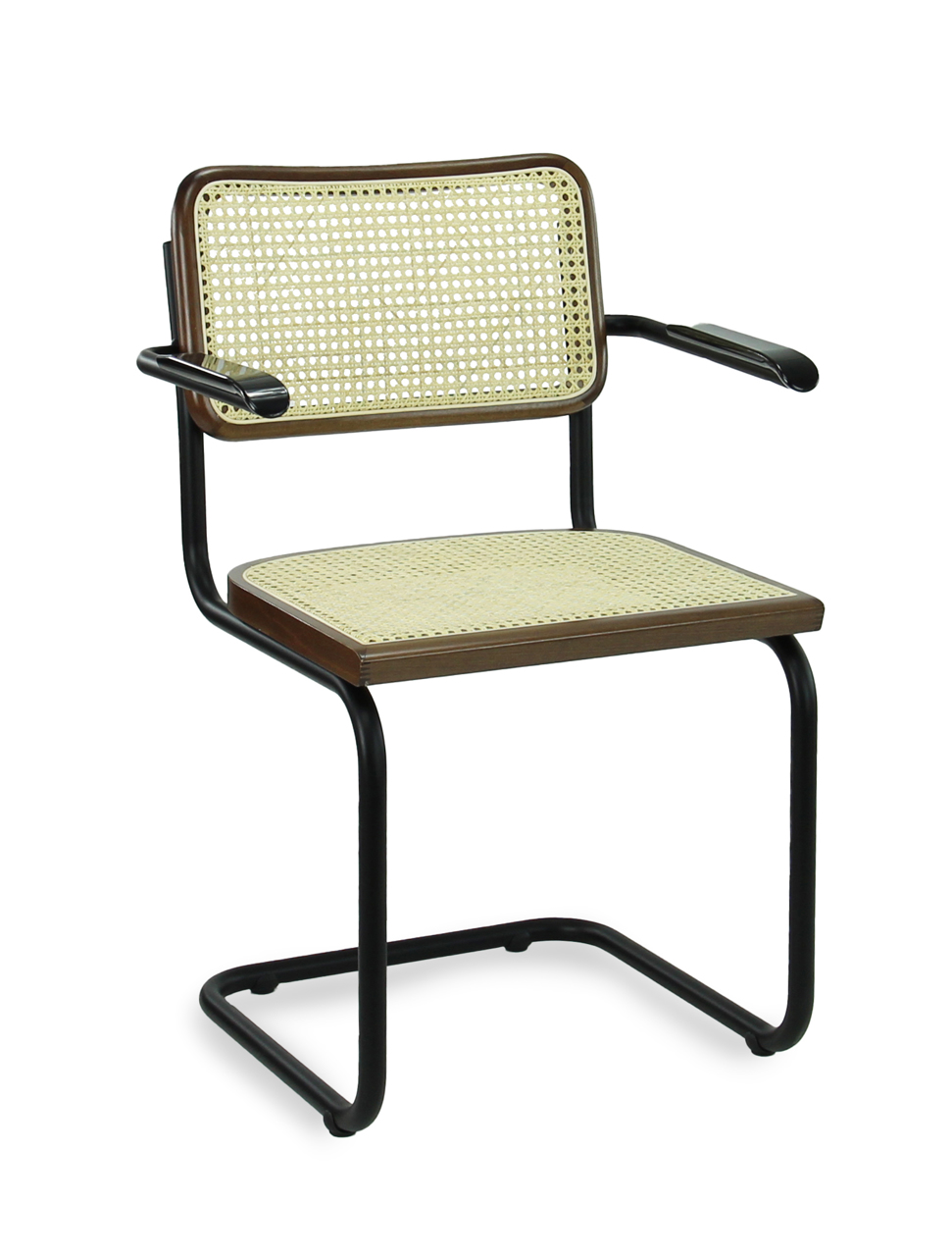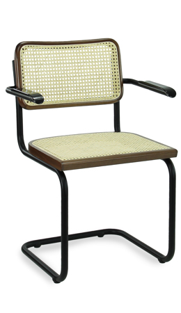 Voorzien van een rugleuning en zitting in het tijdloze webbing is de Francesca een echte Bauhaus klassieker en toch supermodern in deze tijd. De stoel heeft een mat zwart sledeframe walnoot en rand van de zitting en rugleuning, en is voorzien van armleggers gemaakt van gematteerd bakeliet.